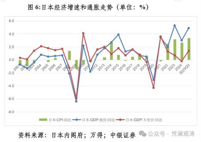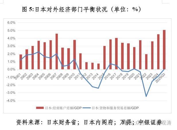 从货色交易看,中国比日本刚劲。日本自2021年以来货色交易执续逆差,同期中国货色交易顺差束缚扩大。但从时常模样看却不果真。中国货色交易顺差,职业交易和投资收益却是逆差,2024年时常模样顺差/国内出产总值(GDP)为2.2%,环比上升0.8个百分点;2025年前三季度该比例进一步升至3.5%,但仍在±4%的海外警戒线以内。日本货色交易和职业交易均是逆差,但投资收益大顺差,2024年时常模样顺差/GDP为4.5%,环比上升0.9个百分点;2025年前三季度该比例进一步升至5.1%,联结两年超出洋际警戒线(见图5)。