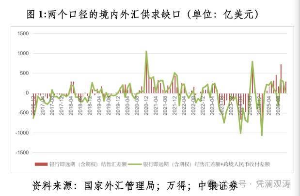 2023年7月至2025年2月,东说念主民币汇率总体承压。除2024年8~10月外,其他月份预计境内主要外汇供求相干的银行即远期(含期权)结售汇(下称“银行结售汇”)均为逆差。2025年3月起,银行结售汇转为执续顺差,东说念主民币增值迹象慢慢涌现,到11月累计顺差2733亿好意思元。同期,银行代来宾民币涉外收付累计净流出1115亿好意思元。鉴于涉外东说念主民币外流后部分将通过跨境东说念主民币算帐渠说念到境内银行间市集购汇平盘,不纳入银行结售汇统计,故境表里汇实验供过于求缺口小于结售汇顺差。其中,11月份,结售汇顺差297亿好意思元,环比仅加多24亿好意思元,且远低于9月份的顺差734亿好意思元;剔除东说念主民币涉外收付净流出后,顺差仅为7亿好意思元,远小于9、10月份分裂为335亿和288亿好意思元的范围(见图1)。