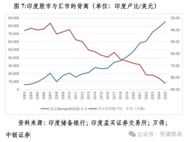 更有不少东说念主将东说念主民币汇率重估与中国钞票重估挂钩。似乎东说念主民币不增值,“9·24”行情以来的中国钞票重估就可能半上落下。但“股汇双升”并非势必。如2023年以来,日元执续走弱,却不影响日本股市联结三年牛市,日经225指数迭创历史新高。再如2025年,好意思元指数重挫,也不影响好意思国三大股指迭创历史新高。还如印度卢比对好意思元汇率自2018年以来连跌八年,印度股市却“八连涨”,一个在迭创历史新低,另一个却在迭创历史新高(见图7)。外汇市集与股票市集本即是不同的钞票价钱运行逻辑,不要望文生义。