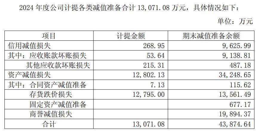 当金钱的可收回金额低于其账面价值时,企业必须计提金钱减值准备。2024 年年报显现,往常公司计提种种减值准备整个 13,071.08 万元,主要为:信用减值损失268.95 万元,金钱减值损失 12,802.13 万元。