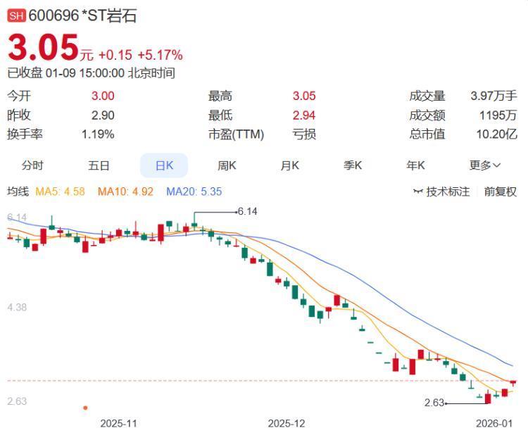 1月9日,*ST岩石报收3.05元,涨5.17%(涨停),二连板,以5.17%列白酒A股周涨幅第一,本年以来涨幅为5.17%。