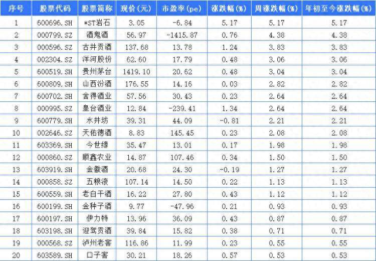 *ST岩石、酒鬼酒、古井贡酒分离以5.17 %、4.38%、3.83%,列白酒A股周涨幅前三。