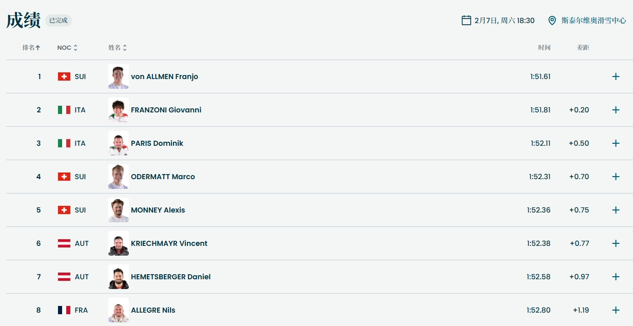 在米兰冬奥会峻岭滑雪男人滑降比赛中,昨年世锦赛冠军、瑞士选手弗兰约·冯·阿尔门以1分51秒61夺得冠军,意大利选手乔瓦尼·弗兰佐尼和多米尼克·帕里斯分获银铜牌。这亦然本届冬奥会出身的第一枚金牌。