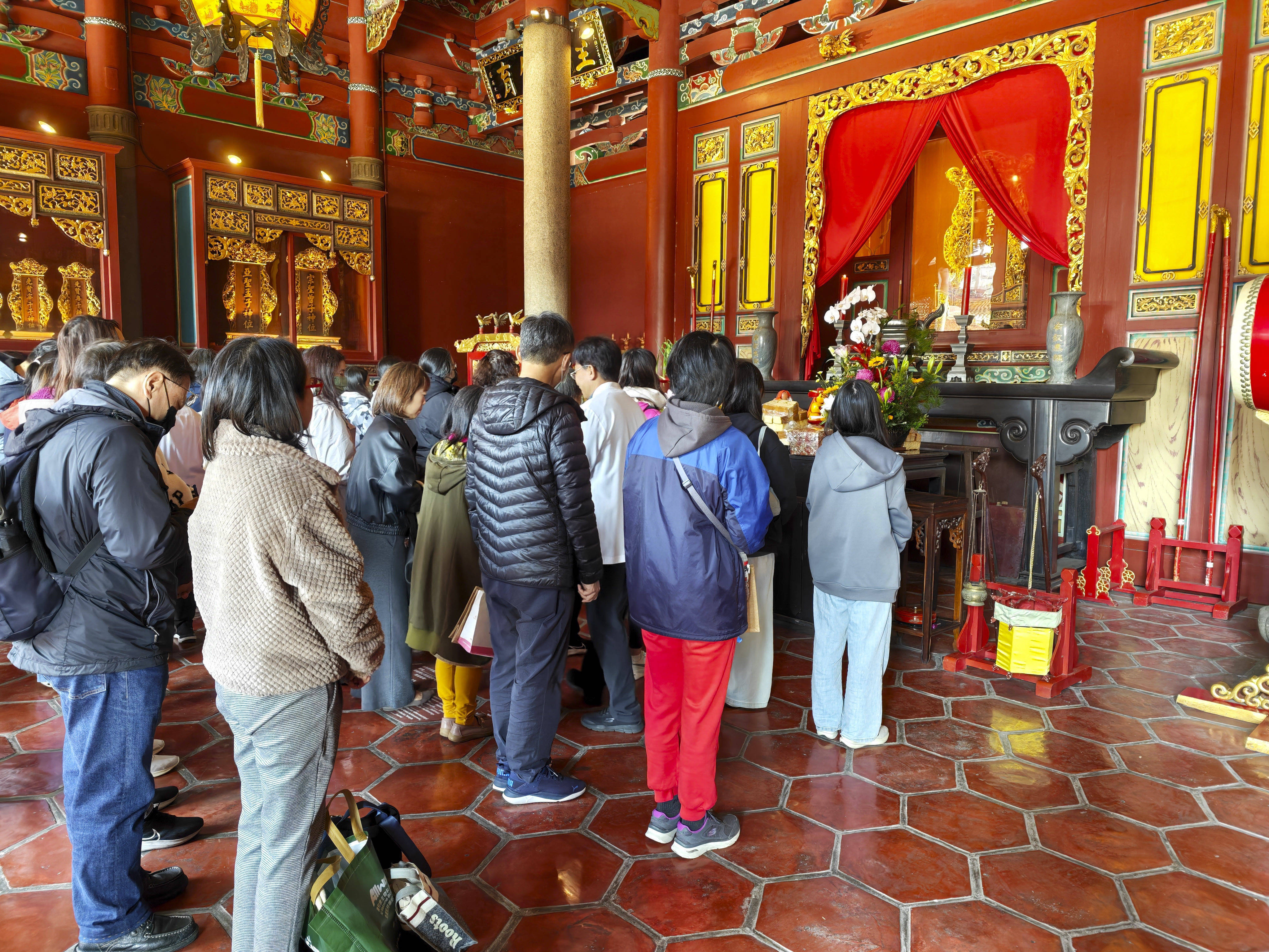 1月10日,考生和家长在台北孔庙大成殿中参加道贺典礼。新华社记者 王承昊 摄一进孔庙,记者便看到报到处前已排起长队。考生和家长们手握学测报考关系解说,郑重填写着祝祷卡,上头写有考生的姓名、生辰、住址以及老师方位和准验证号。军队中不少是后生学子,也有考生因冲刺备考无法到场,挑升委托家东谈主代为道贺。