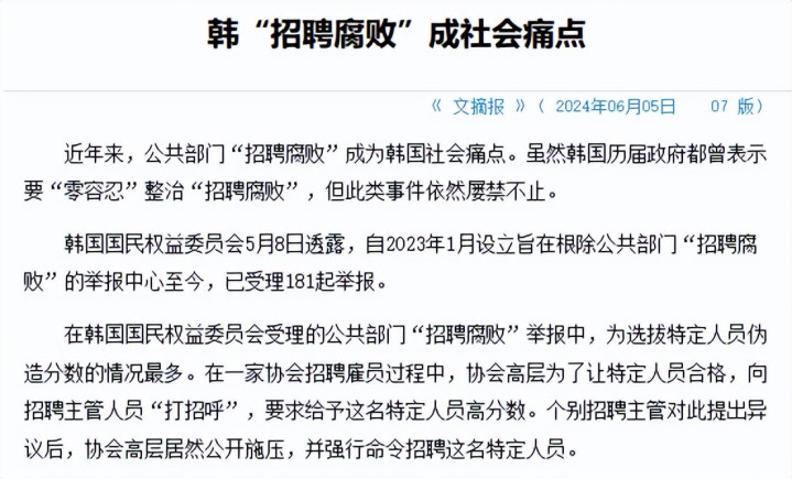 在2023年的时间,韩国为了能保证群众部门岗亭的招聘公说念,专门树立了一个国民职权委员会,但遵循树立没多久,接到的“招聘靡烂”举报信就多的数不外来,在访谒的经由中发现,有逾越三分之一的岗亭齐存在不公说念嫌疑。